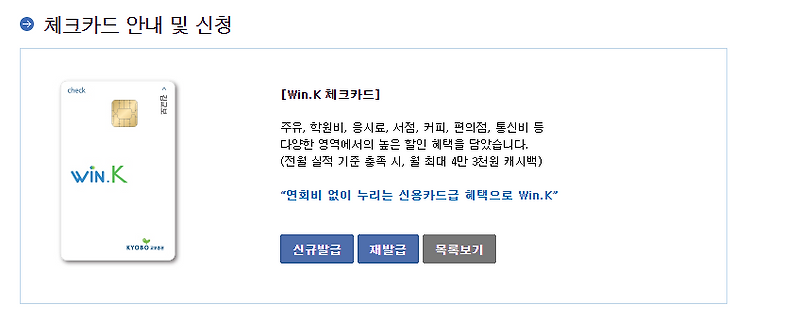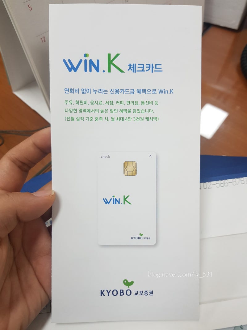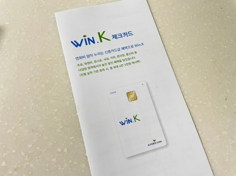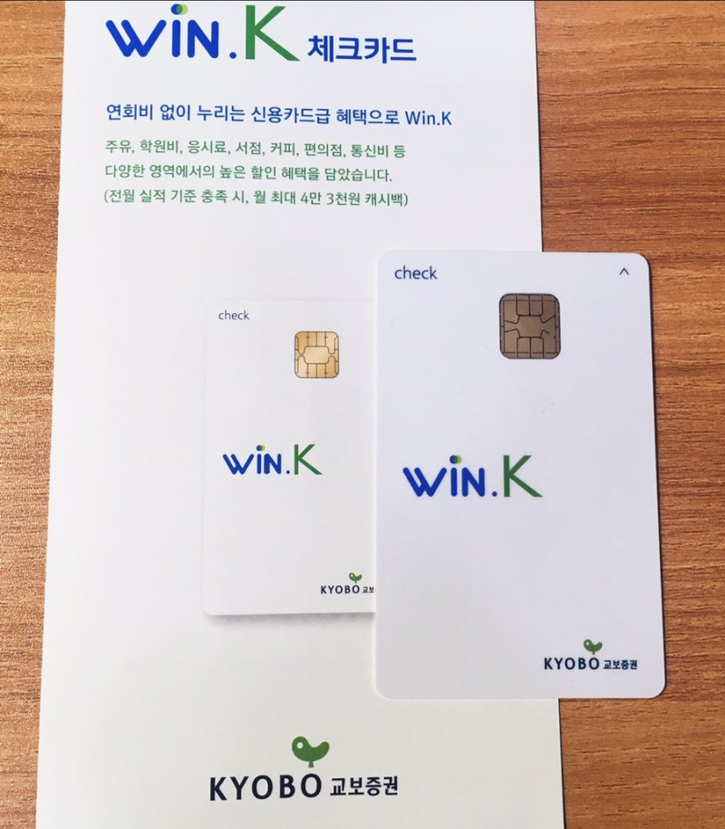 혜택이 좋다고 생각해서 작년에 유튜브로 발급받은 체크카드가 있는데요. 교보증권의 Win.K 체크카드입니다. 남편이 사용하는 카드인데 남편이 원하면 좋을 것 같아요 휘발유 할인 🙂 주유비, 통신비, 편의점, 카페 등을 할인해 주는 카드입니다.