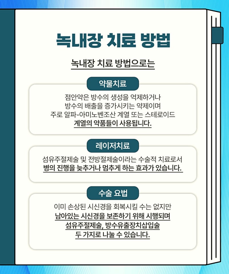 녹내장은 지속적인 관리가 중요합니다. 처방된 안약을 정기적으로 사용하여 안압을 관리하고, 정기적인 안과 검진을 통해 증상의 경과 및 안압을 지속적으로 확인하는 것이 좋습니다. 녹내장의 원인과 초기증상, 치료방법, 수술방법을 소개합니다. 나는 그것을 조사했다.