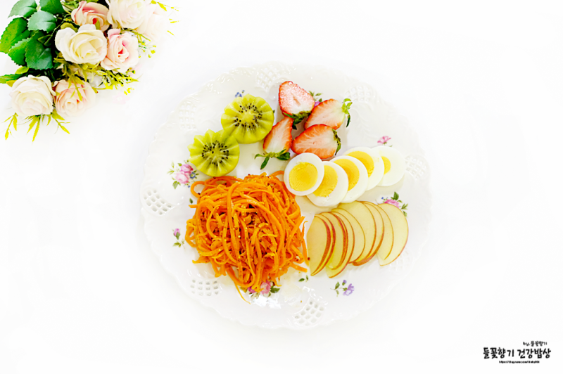 당근라떼, 그린키위, 딸기, 달걀, 사과를 접시에 담으면 채식 레시피가 완성됩니다. 요거트나 그래놀라와 함께 드시면 브런치 샐러드로도 굿~~! 맛있게 만들어 드세요~~^^