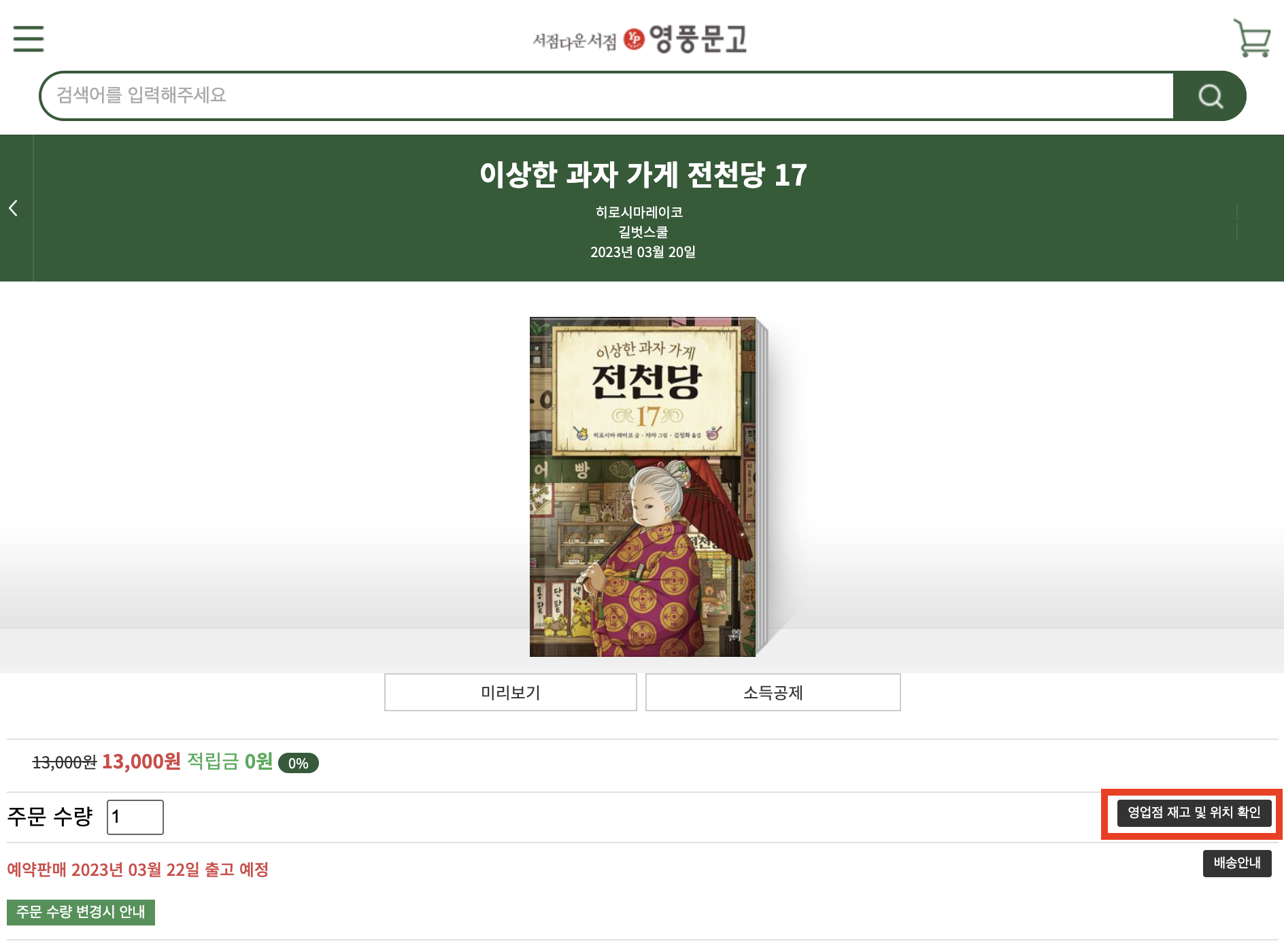 오른쪽 중간에 클릭 (상점 재고 및 위치 확인)도서, 재고, 위치가 있는 매장은 아래와 같습니다.