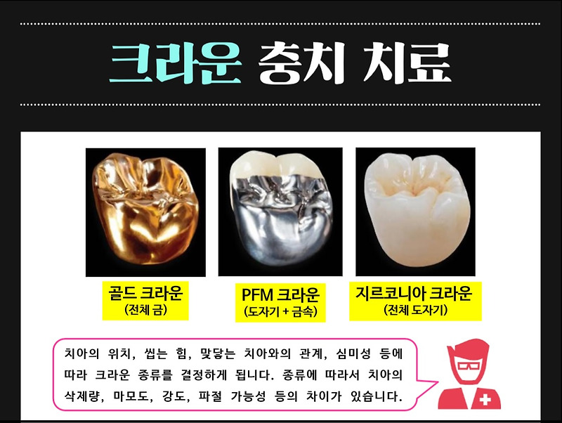 크라운은 폭넓은 치아 손실을 복구하고 대체하는 인공 치아를 말합니다.그림으로 볼까요?크라운의 종류에는 대표적으로 1. 지르코니아 2. 골드 3.pfm 세 가지가 있습니다.원래는 3가지 이상 있는데 가장 대표적인 종류는 저렇게 3가지입니다. 치아 크라운의 종류별 장점과 단점, 그리고 가격은?지르코니아는 현재 강도가 가장 단단한 자연 치아와 비슷한 색과 질감을 가지고 현재 치과계에서 가장 많이 이용되는 크라운입니다. 지르코니아 치아의 크라운 가격, 보통 어금니 50앞니 60정도가 표준이라고 생각합니다.골드는 과거부터 오랫동안 사랑 받고 온 재료로 크라운으로도 정말 잘 쓰이던 재료인데, 심미적으로 보고 싶지 않은 일, 그리고 지르코니아의 물성이 좋아지면서 점점 지르코니아로 바뀌어 요즘은 과거만큼 많은 사용되지 않은 것 같습니다.골드 치아 크라운의 가격 60정도가 표준이라고 생각합니다. 최근 금값이 크게 오르고 다른 재료보다 상대적으로 많죠.pfm의 경우 2층으로 되어 있는데, 내부는 금속으로, 외측은 치아 색깔에 비슷한 도자기 재질(포 세린)으로 되어 있습니다.치아 색과 유사한 부분인 도자기 재질이 강도가 약하고 파절(fracture)또는 균열(chipping)이 자주 발생하는 최근 사용 빈도가 대폭 줄어든 재료입니다.pfm이 크라운의 가격은 40~45만원 정도가 표준이라고 생각합니다.결론은 지르코니아가 대인기!아래의 글도 참고로 봐주세요지르코니아 크라운 금니의 가격 차이를 공개하는 이 글은 바른플랜트 치과 대표원장이 직접 작성한 글입니다. 크라운 치료를 앞두고 있습니까? 아니면 치과에 간다… blog.naver.com지르코니아 크라운 금니의 가격 차이를 공개하는 이 글은 바른플랜트 치과 대표원장이 직접 작성한 글입니다. 크라운 치료를 앞두고 있습니까? 아니면 치과에 간다… blog.naver.com지르코니아 크라운 치료 사례오늘은 지르코니아 크라운과 이맥스 인레이를 이용하여 충치 치료한 사례를 소개해 드리겠습니다. 전체 검진을 원합니다.50대 여성이 치과에 내원해 주었습니다.아픈 곳은 없지만 전체 검진을 원했습니다.제 눈에 띄는 부분은 바로 저 부분입니다.(노란색 화살표) 흔히 불량 보철물이라고 합니다.크라운이 치아와 정확하게 적합도가 맞지 않는 상태에서 저런 경우 크라운을 떼어내면 내부 충치가 상당히 진행되고 있는 것은 어느 정도 예측할 수 있습니다.역시 제 예상은 틀리지 않았고 충치가 너무 깊어 신경치료가 꼭 필요한 상황이었습니다.인접한 옆니에도 충치가 생겼네요신경 치료를 꼼꼼히 마치고 치아 대체 물질을 제대로 채운 모습입니다.크라운이 들어갈 공간을 마련했습니다.prep라고 하는데 오늘도 어김없이 플렙이 꽤 잘 됐네요.이제 기공소와의 협업입니다.구강 내 상태 정보를 최대한 잘 전달하면 기공소에서는 치과에서 받은 정보를 바탕으로 최대한 적합도가 좋고 교합점도 잘 딸 수 있는 크라운을 만들어 줍니다.실력 있는 기공소와 거래하면 더 좋을 수밖에 없어요.네… 역시 오늘도 자연스럽게 치료가 무사히 끝난 것 같아요.네… 역시 오늘도 자연스럽게 치료가 무사히 끝난 것 같아요.50m 네이버 더보기 / 오픈스트리트맵지도데이터x 네이버 / 오픈스트리트맵지도컨트롤러 범례부동산대로읍,면,동시,군,구시,도국바른플랜트치과의원 서울특별시 중랑구 망우로 402 예약본 게시물은 바른플랜트치과 대표원장이 직접 작성한 글입니다. 무단 복사 및 배포를 금지합니다.
