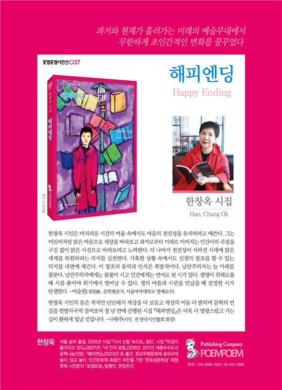 Happy Ending – Poetry by Han Chang-ok (Poem Poem) 서문 한창옥 시인은 격동의 시대 속에서도 마음의 순수함을 유지하고자 노력한다. 그는 어린아이처럼 맑은 마음으로 세상을 바라보고 과거로부터 배운다.