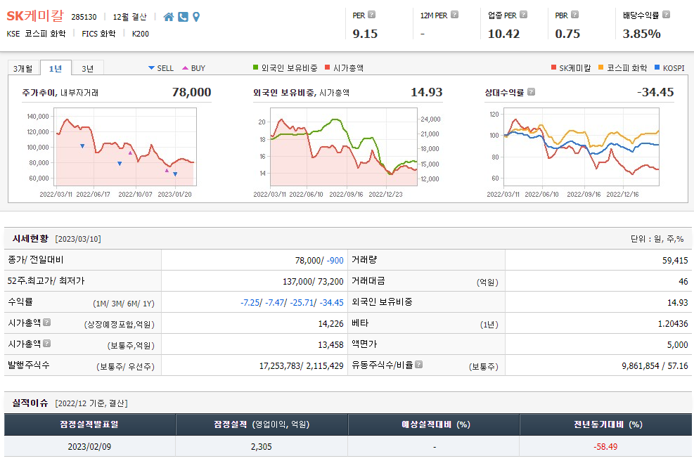 SK케미칼의 현재 주가는 전일 대비 -900원 하락한 78,000원이다. SK케미칼의 주주현황을 고려하면 SK디스커버리 외 8개사가 42.66%의 지분을 보유하고 있다. SK케미칼은 장중 주가가 7만8000원인 화학기업이다. 삼성전자의 시가총액은 1조3458억원, 발행주식수는 1493만주다. 외국인 참여율은 59,415%, 일중 거래량은 17,253,783건이었다. 매출액은 13억5200만원, 영업이익은 5552억원이다. EPS는 없고 SK케미칼 주식의 배당수익률은 2.01%이다.